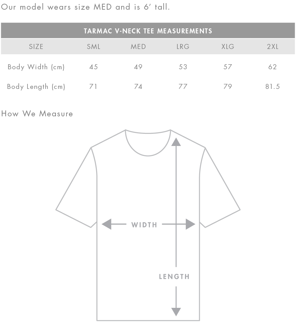 FIT: Slim fit - please check the size chart to avoid disappointment. Lay your own tee flat on a table, measure armpit to armpit across the chest and match to the size you feel is best. Please note measurements can vary within 2.5cm, this is within the accepted tolerance.
