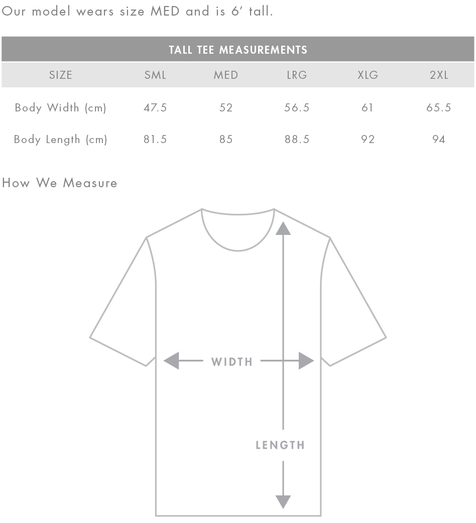 FIT: Regular Fit + EXTRA long - please check the size chart to avoid disappointment. Lay your own tee flat on a table, measure armpit to armpit across the chest and match to the size you feel is best. Please note measurements can vary within 2.5cm, this is within the accepted tolerance.