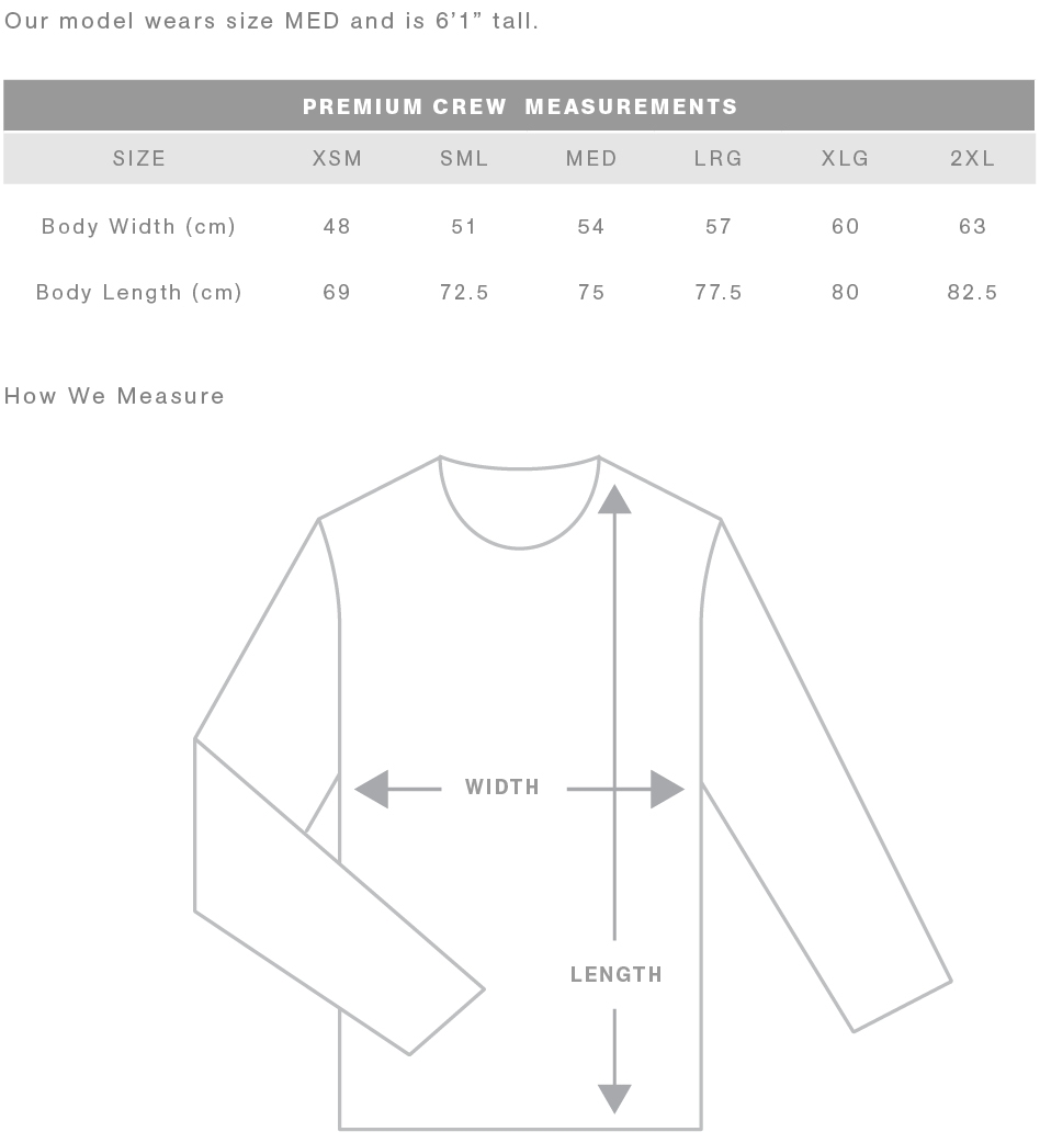 FIT: Relaxed fit - please check the size chart to avoid disappointment. Lay your own tee/sweater flat on a table, measure armpit to armpit across the chest and match to the size you feel is best. Please note measurements can vary within 2.5cm, this is within the accepted tolerance.